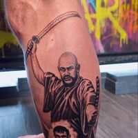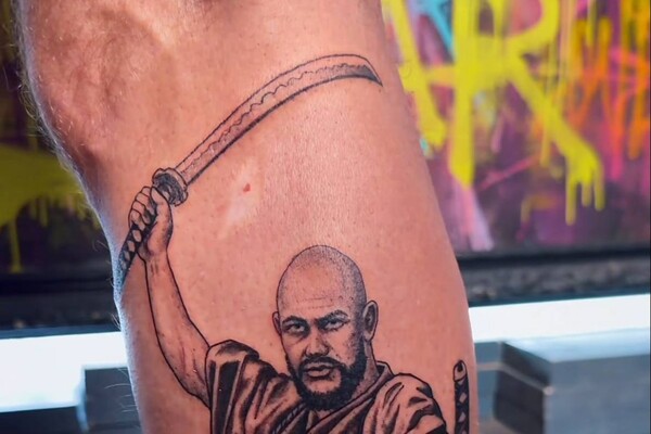 Джиган посетил мастера по тату вместе со своим сыном Давидом. Рэперу сделали на ноге татуировку — самурая, который держит в руках мечи. Рядом с исполнителем в костюме война сидел его наследник.