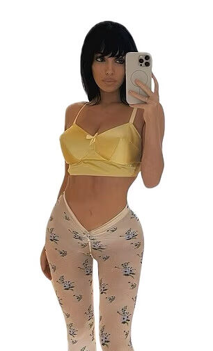 На одном из кадров Бьянка Цензори предстала в желтом бюстгальтере с конусами, который дополнила полупрозрачными белыми лосинами с цветочным принтом и блестящими атласными туфлями на каблуках. Модель была запечатлена с распущенными волосами и макияжем с темными тенями. На других снимках жена Канье Уэста позировала в похожих образах в ретро стиле.