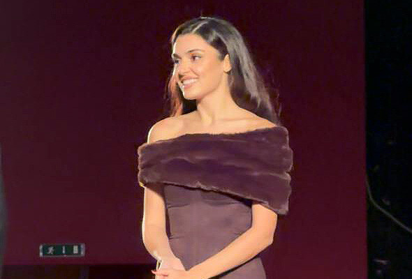 Ханде Эрчел предпочла для выхода коричневое мини-платье с отделкой из меха. Образ дополнили лодочки с острым мысом и на высоких каблуках. Волосы ей распустили и сделали легкий вечерний макияж.
