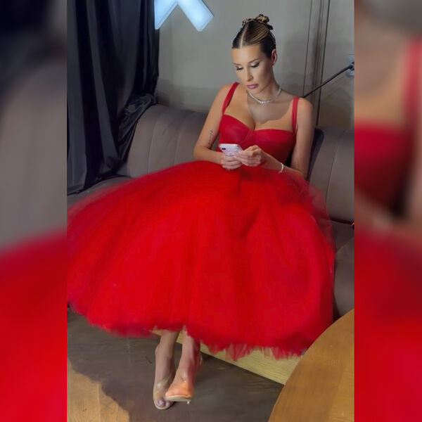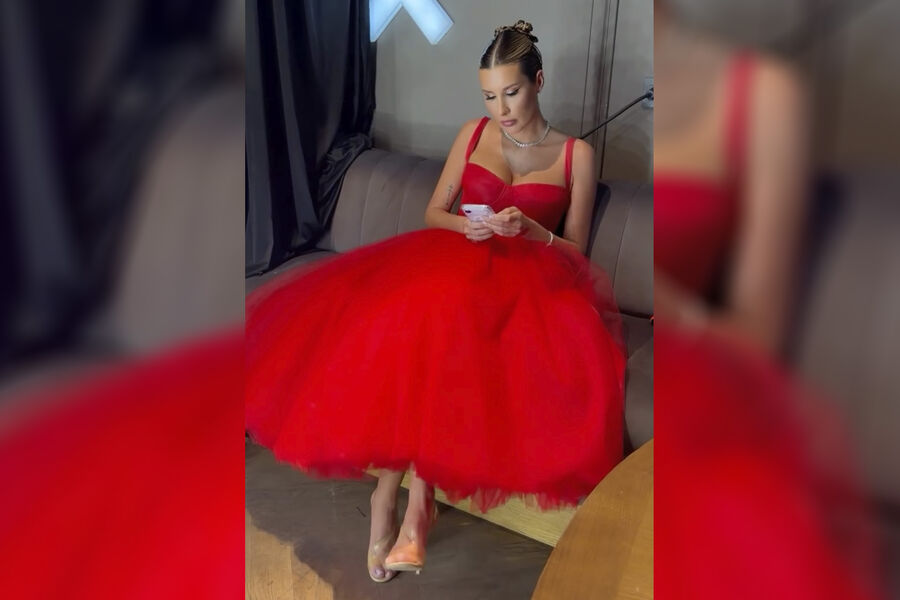 39-летняя Кети Топурия была запечатлена в красном макси-платье с глубоким декольте и пышной юбкой. Певица также надела прозрачные босоножки на каблуках, браслет и ожерелье с бриллиантами. Поп-исполнительница предстала перед камерой с уложенными волосами и макияжем с черными стрелками, серебристыми тенями и розовой помадой.