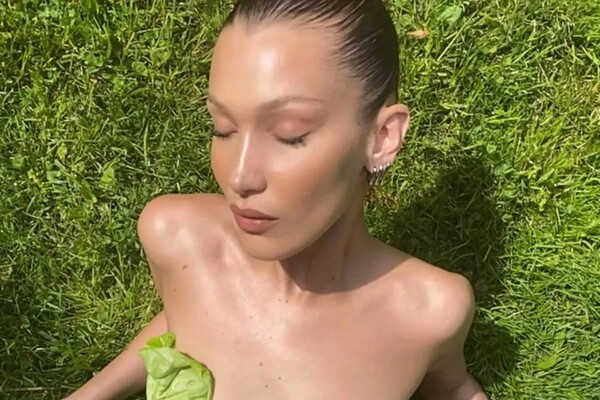 29-летняя Белла Хадид позировала перед камерой, сидя на траве. Супермодель прикрыла тело листьями капусты. Бизнесвумен была запечатлена с уложенными в пучок волосами и макияжем в естественном стиле.