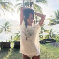 29-летняя Нара Баптиста предстала перед камерой в белой футболке и трусах в тон. При этом модель не стала надевать бюстгальтер. Манекенщица позировала с собранными волосами с прядями у лица и без макияжа. Знаменитость стояла на фоне пальм и океана.