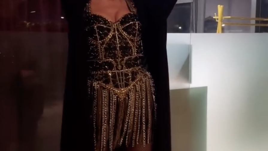 54-летняя Кристина Орбакайте предстала перед камерой в черном мини-платье с декольте, которое было украшено стразами. Певица добавила к наряду колготки, туфли на каблуках и блестящую накидку. Поп-исполнительница сделала макияж с черными стрелками и красной помадой и собрала волосы в высокий хвост.