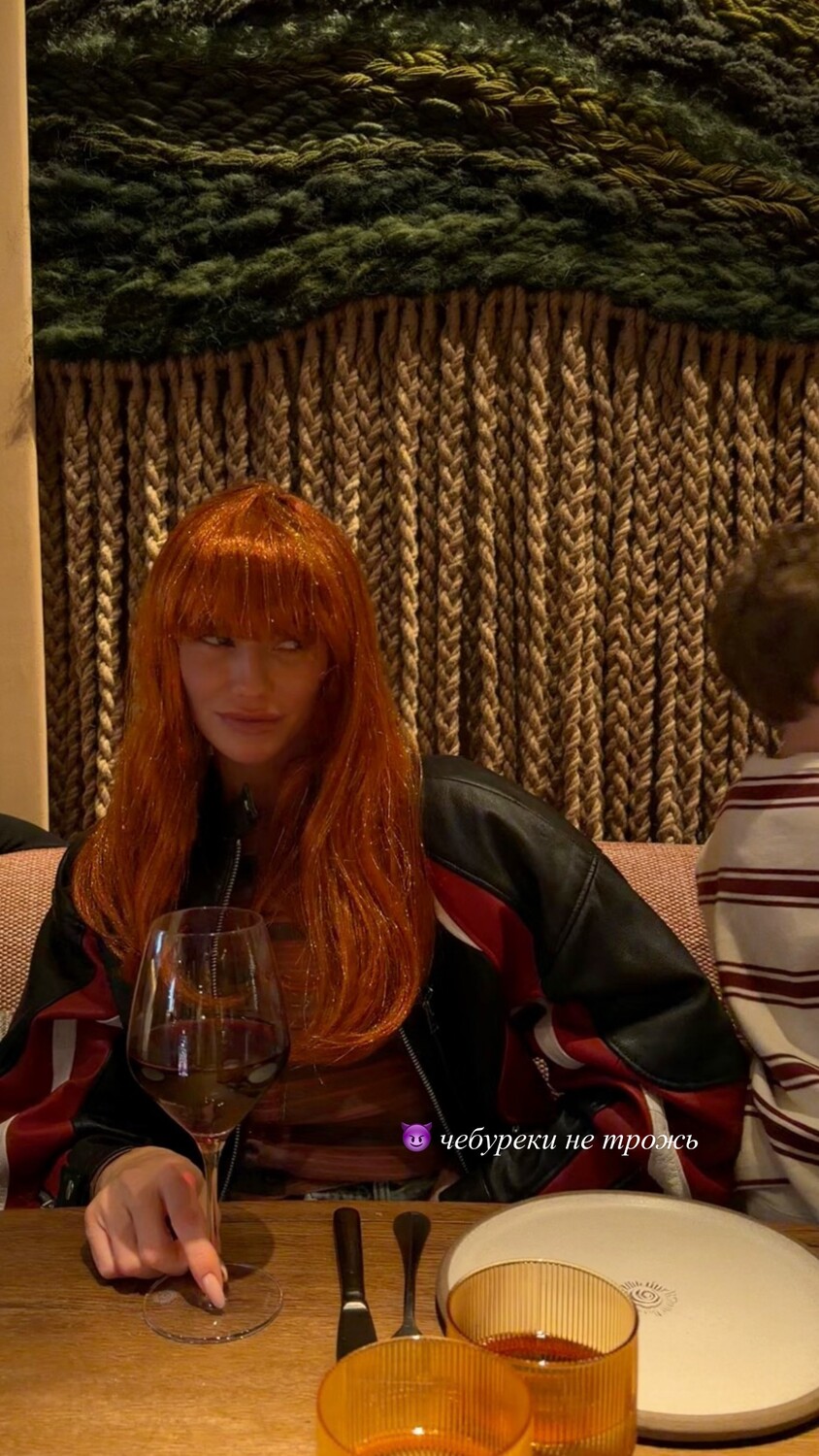 Елена Перминова позировала за столом в ресторане. Модель примерила новый образ — длинный рыжий парик с челкой. Она также была одета в черный бомбер из кожи и топ с глубоким декольте.