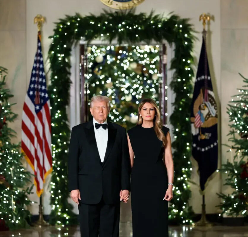 Дональд и Мелания Трамп позировали перед фотографом внутри украшенного Белого дома. Первая леди США предстала перед камерой в черном макси-платье, которое дополнила серьгами и браслетом. Бизнесвумен уложили распущенные волосы и сделали макияж. Политик был одет в белую рубашку с бабочкой, костюм и туфли.