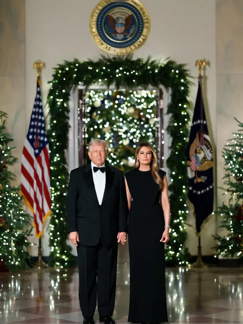 Дональд и Мелания Трамп позировали перед фотографом внутри украшенного Белого дома. Первая леди США предстала перед камерой в черном макси-платье, которое дополнила серьгами и браслетом. Бизнесвумен уложили распущенные волосы и сделали макияж. Политик был одет в белую рубашку с бабочкой, костюм и туфли.