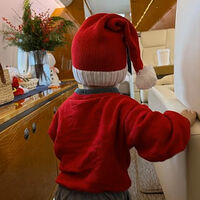 Годовалый Джек Блюз был запечатлен в вязаной шапочке Санты, красном свитере и серых брюках. Сын певца и модели стоял спиной к камере и смотрел на салон частного самолета. Внутри джет был украшен миниатюрным снеговиком, декорациями в виде Санта-Клауса и зимнем букетом красно-зеленых цветов.