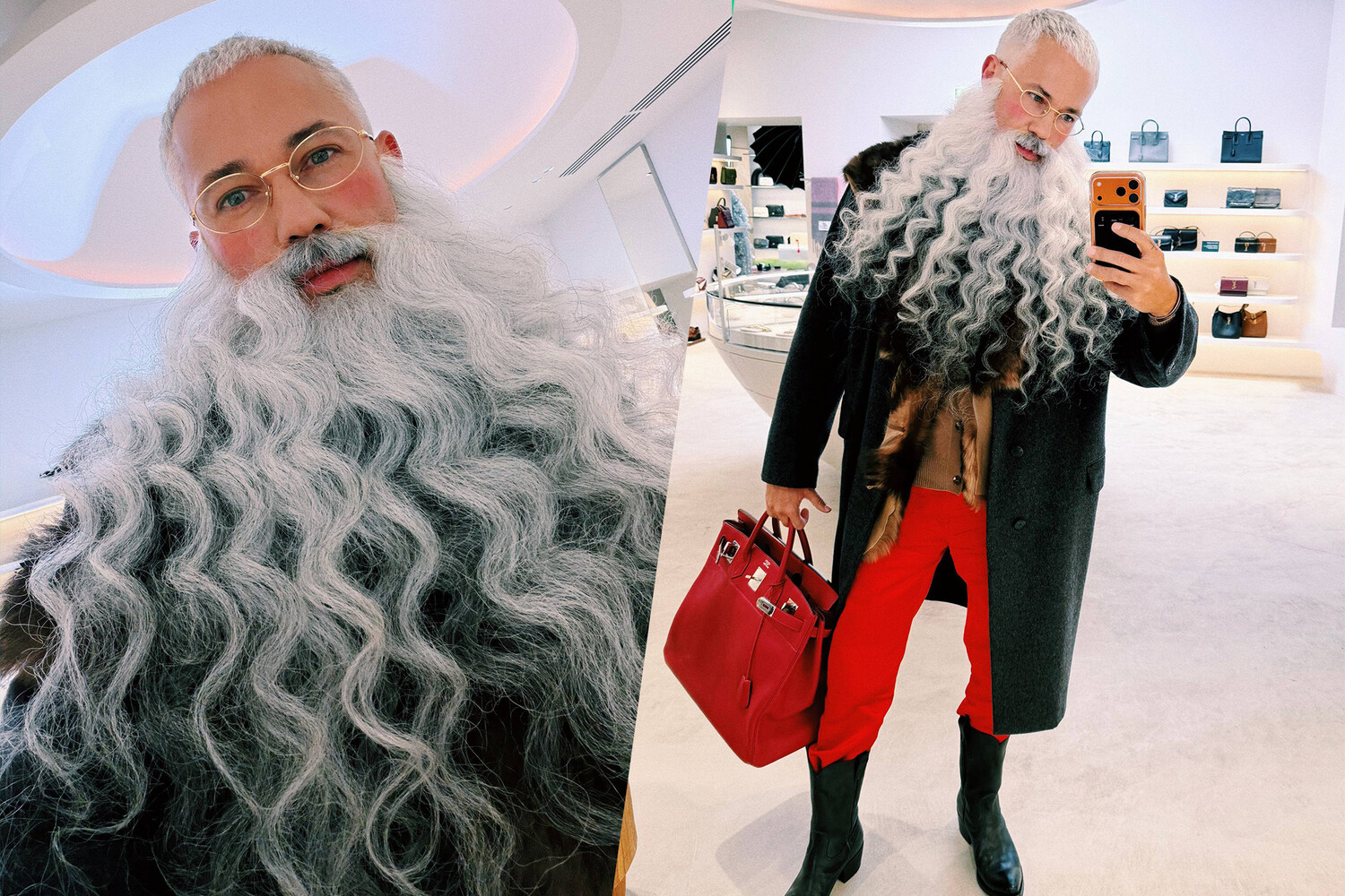 Александр Рогов позировал в красных джинсах, коричневой рубашке, топе и черном пальто. Образ дополнила седая борода, очки и сумка Birkin от Hermes, стоимостью 3 миллиона рублей.