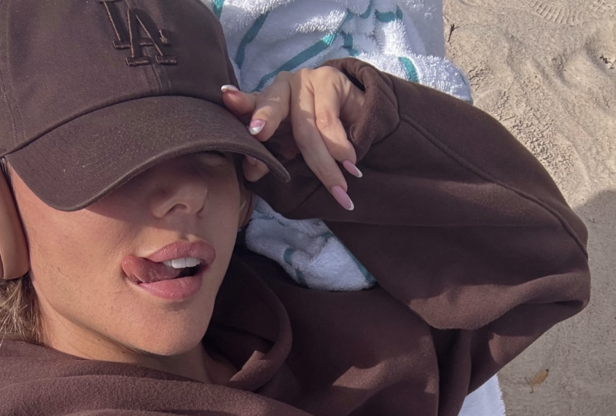 Анна Седокова предстала перед камерой в леопардовом слитном купальнике, который дополнила шоколадным худи и кепкой в тон. Поп-исполнительница убрала волосы под головной убор. Певица в наушниках лежала в шезлонге.