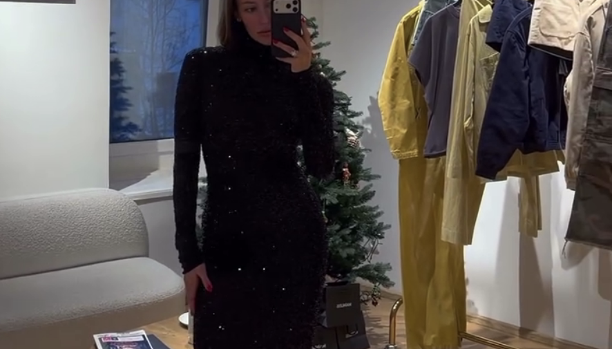 Валентина Иванова стояла перед зеркалом в черном облегающем макси-платье, которое было полностью украшено пайетками. Девушка Тимати была запечатлена с уложенными распущенными волосами и макияжем в нюдовых тонах на фоне елки.