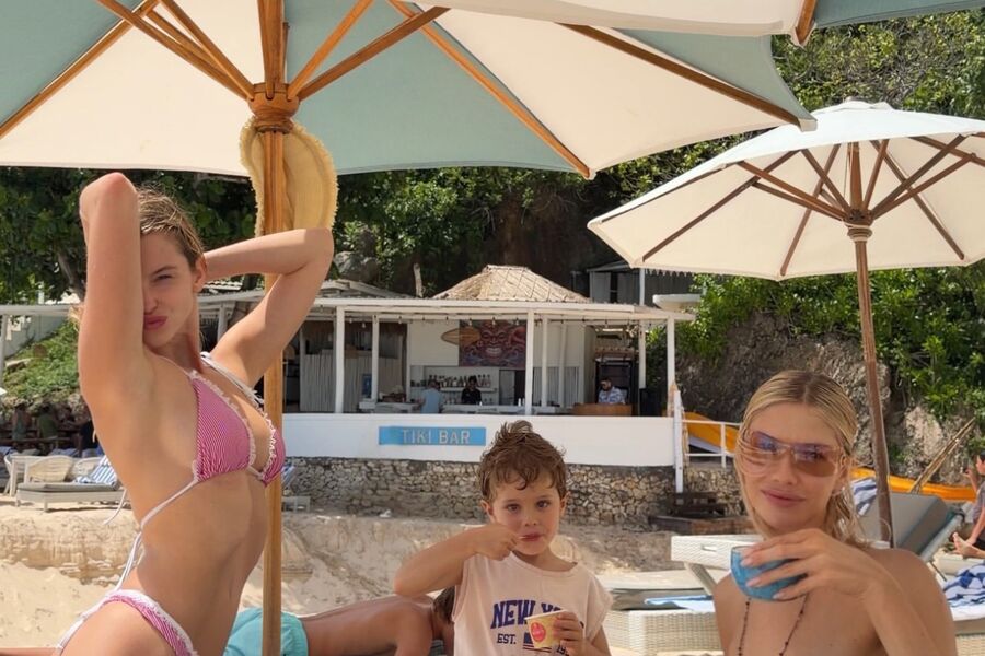 Елена Перминова позировала в черном крошечном бикини и солнцезащитных очках. Волосы модель собрала в пучок и отказалась от макияжа. В кадре также позировал сын модели и ее подруга, блогерша Алла Брулетова.
