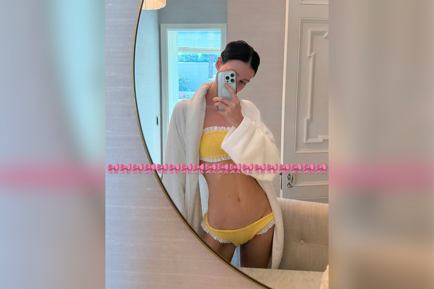 30-летняя Никола Пельтц-Бекхэм стояла перед зеркалом в желтом купальнике с белыми вставками, который дополнила махровым халатом. Модель была запечатлена с собранными волосами и без макияжа.