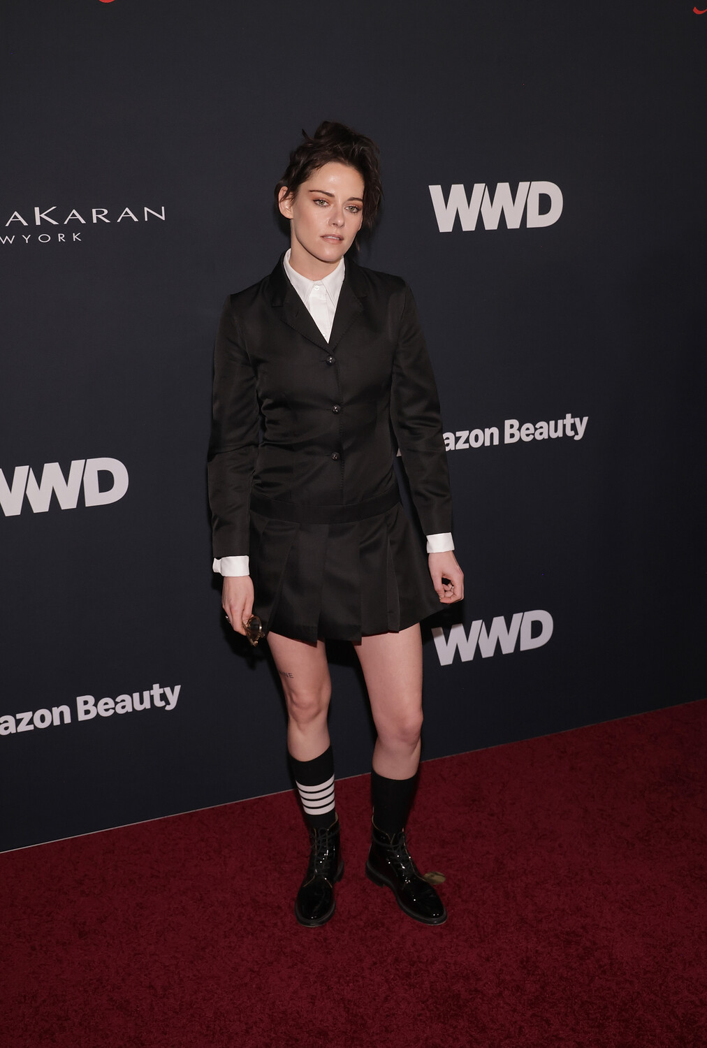 35-летняя Кристен Стюарт посетила церемонию вручения премии Women's Wear Daily's, которая прошла 9 января в Лос-Анджелесе. Актриса предпочла для закрытого светского мероприятия черный жакет и мини-юбку в тон от Thom Browne. Артистка добавила к образу белую рубашку, высокие носки и ботинки. Знаменитости уложили волосы и сделали макияж с коричневыми тенями, румянами и помадой.