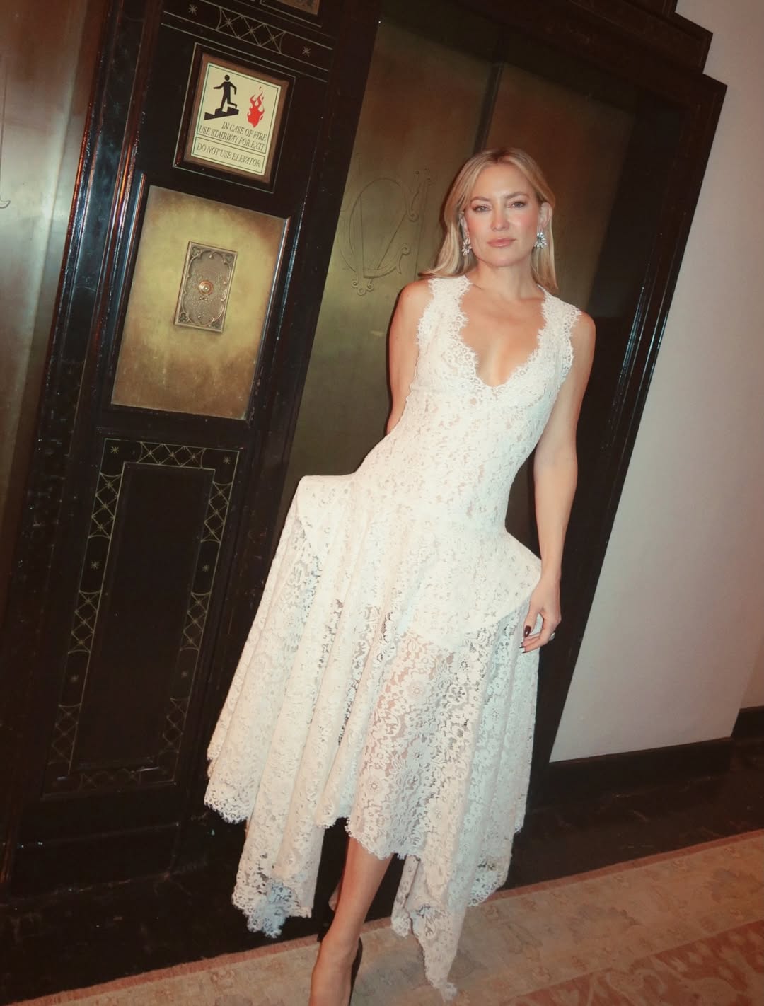 46-летняя Кейт Хадсон показала фигуру в белом кружевном платье-миди с глубоким декольте и объемными бедрами, которое дополнила черными туфлями на каблуках. Актриса также надела массивные блестящие серьги. Знаменитости уложили распущенные волосы и сделали макияж в нюдовых тонах с коричневыми стрелками.