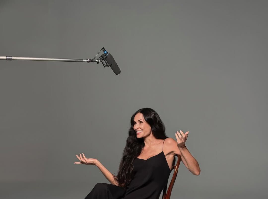 63-летняя Деми Мур позировала в черном платье комбинации с глубоким декольте, отказавшись от нижнего белья. Волосы ей распустили и сделали легкий макияж.