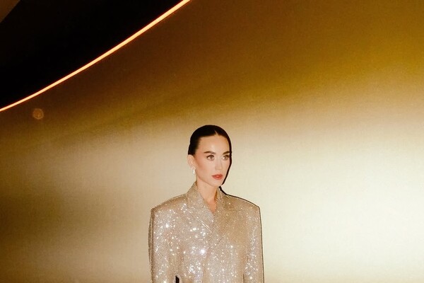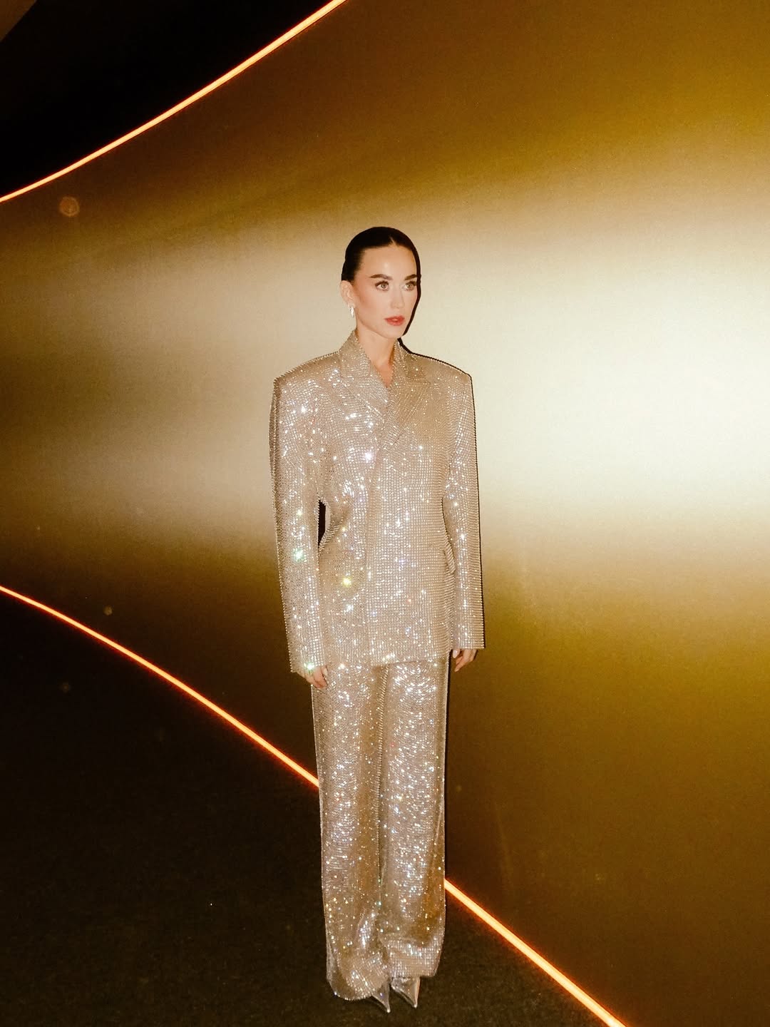 Кэти Перри позировала перед камерой в золотом брючном костюме, который был украшен стразами. Певица также надела серебристые туфли на каблуках и серьги. Поп-исполнительница была запечатлена с уложенными в гладкий пучок волосами и макияжем с черными стрелками, рунами и красной помадой.