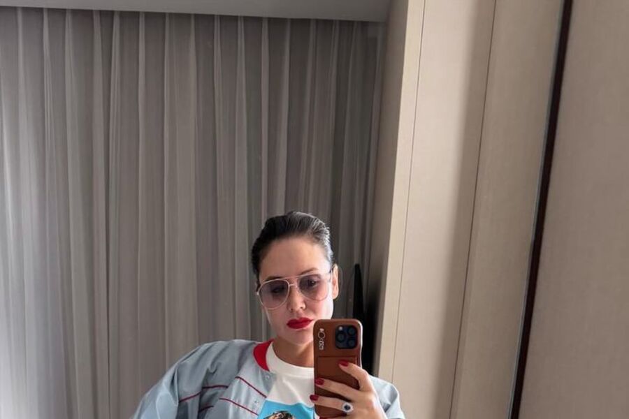 40-летняя Ляйсан Утяшева стояла перед зеркалом в белой футболке с изображением собаки породы такса, которую сочетала с голубым бомбером, красной мини-юбкой и бордовыми кроссовками. Гимнастка добавила к образу солнцезащитные очки, кольца и белые высокие носки с полосками. Знаменитость собрала волосы в гладкий пучок и сделала макияж с красной помадой. Под фото знаменитость поинтересовалась, что поклонники думают о ее новом образе.