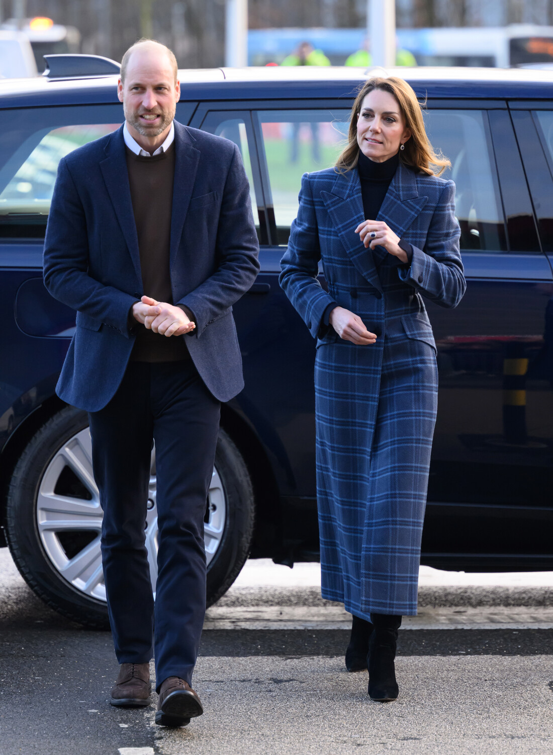 Принц и принцесса Уэльские сделали портреты на фоне скульптуры The Kelpies, а затем прогулялись по городу. Для официального визита пара выбрала пальто синего оттенка.