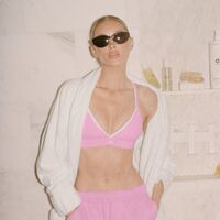 Эльза Хоск позировала в розовом бюстгальтере, спортивных брюках и солнцезащитных очках. Волосы ей уложили в низкий пучок и сделали легкий макияж.