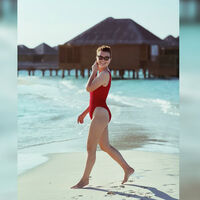Татьяна Брухунова позировала в красном слитном купальнике с глубоким декольте. Волосы стилистка распустила и отказалась от макияжа. В кадре она заходила в океан, чтобы искупаться.