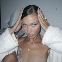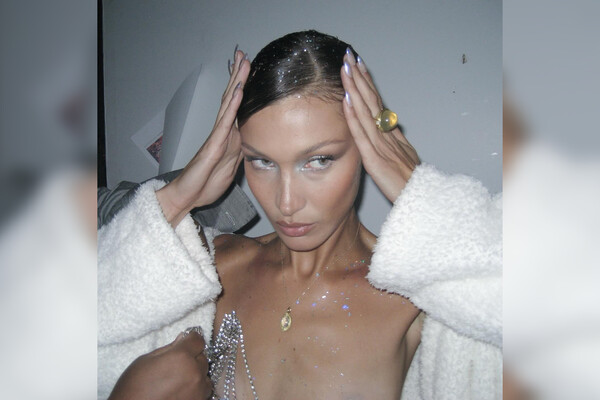 Белла Хадид позировала в черном платье с голыми ягодицами и спиной из архивной коллекции бренда Jean Paul Gaultier 2001 года. Образ дополнила кружевная маска и золотой браслет. Съемка прошла за ужином в ресторане.
