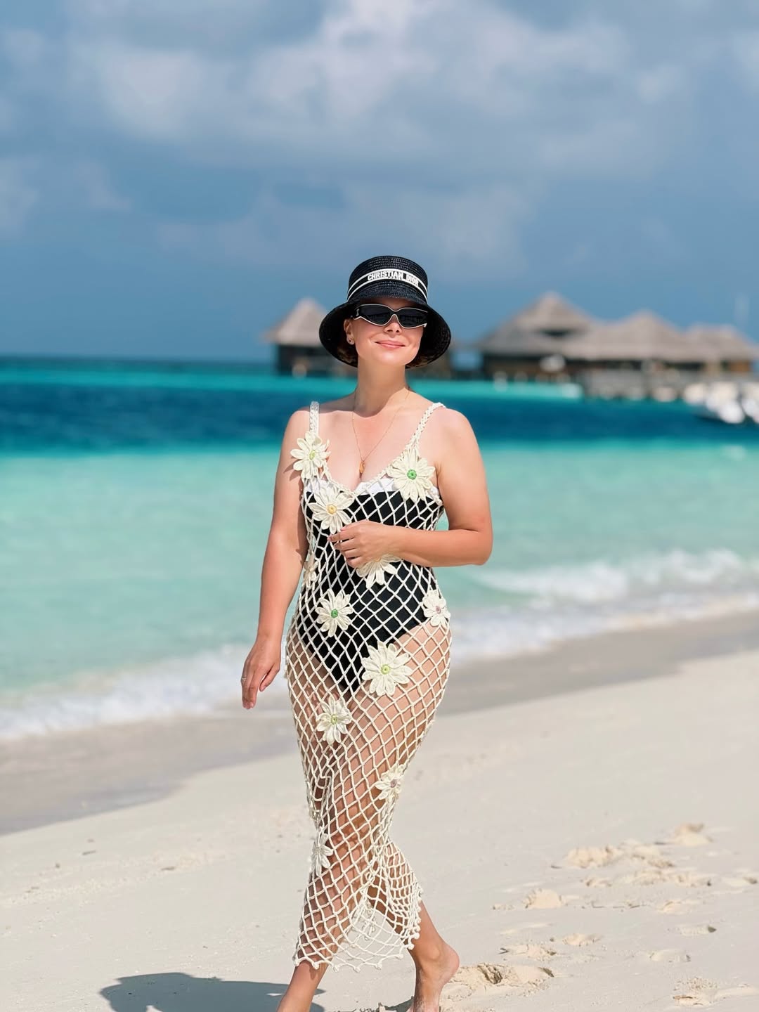36-летняя Татьяна Брухунова показала кадр, сделанный во время отдыха на Мальдивах. Блогерша предстала перед камерой в черном слитном купальнике, поверх которого надела платье-сетку с аппликацией в виде ромашек. Жена Евгения Петросяна дополнила пляжный образ солнцезащитными очками, панамой Dior и золотым ожерельем. Знаменитость отказалась от макияжа и убрала волосы под головной убор.