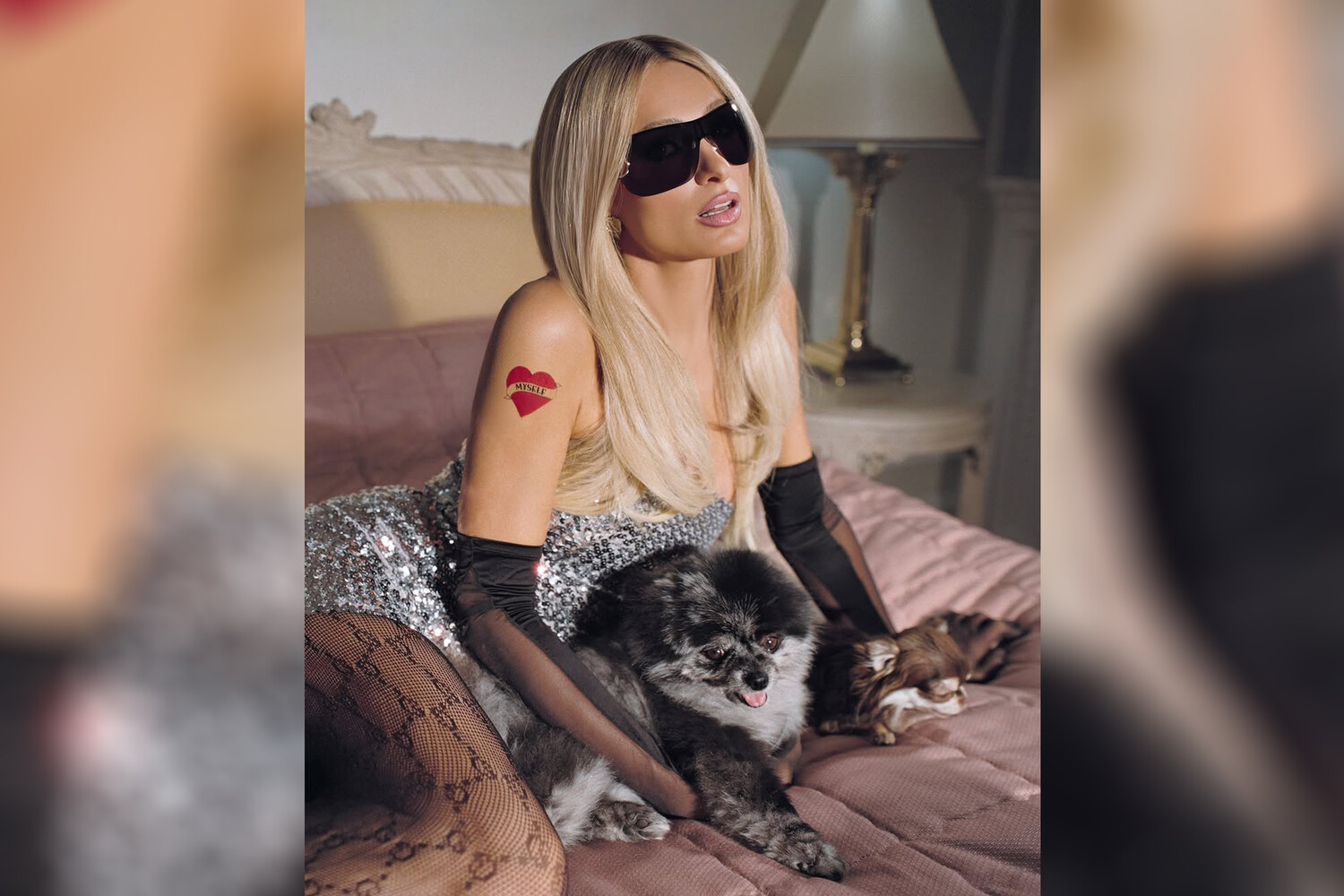 44-летняя Пэрис Хилтон в блестящем мини-платье и кружевных колготках снялась на кровати