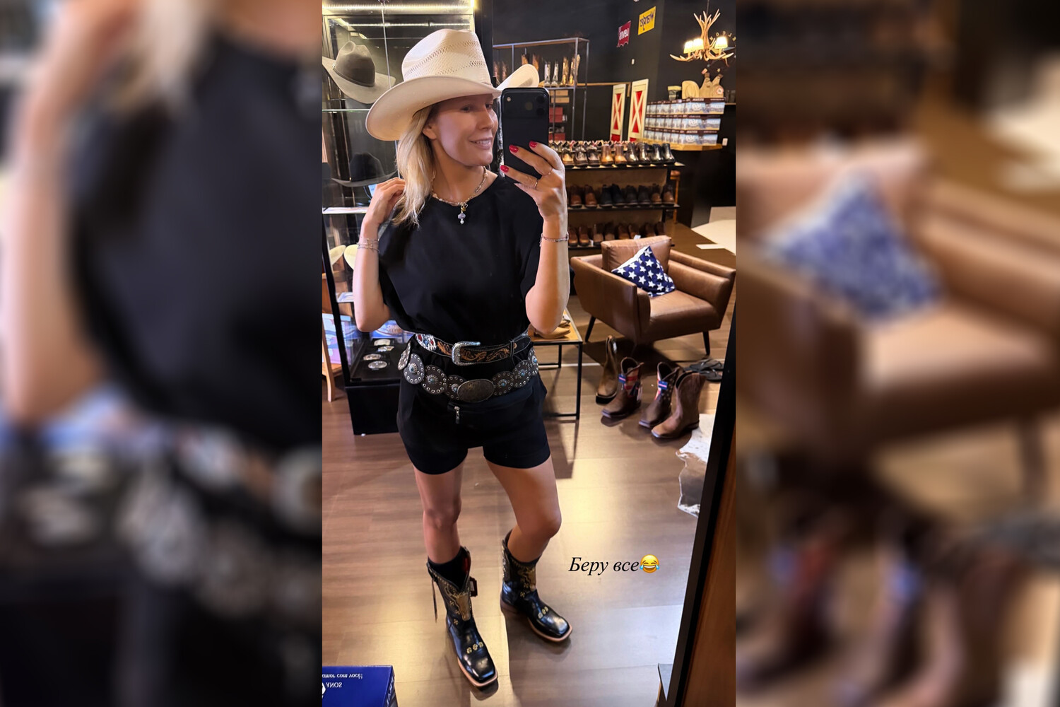 47-летняя Елена Летучая позировала в черном топе, велосипедках и ремнях с массивными пряжками. Образ дополнили грубые ботинки и ковбойская шляпа. При этом ведущая отказалась от макияжа и укладки. На других кадрах она также показала мужа, который выбирал ботинки для покупки. Пара уже несколько недель путешествует по Южной Америке.