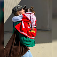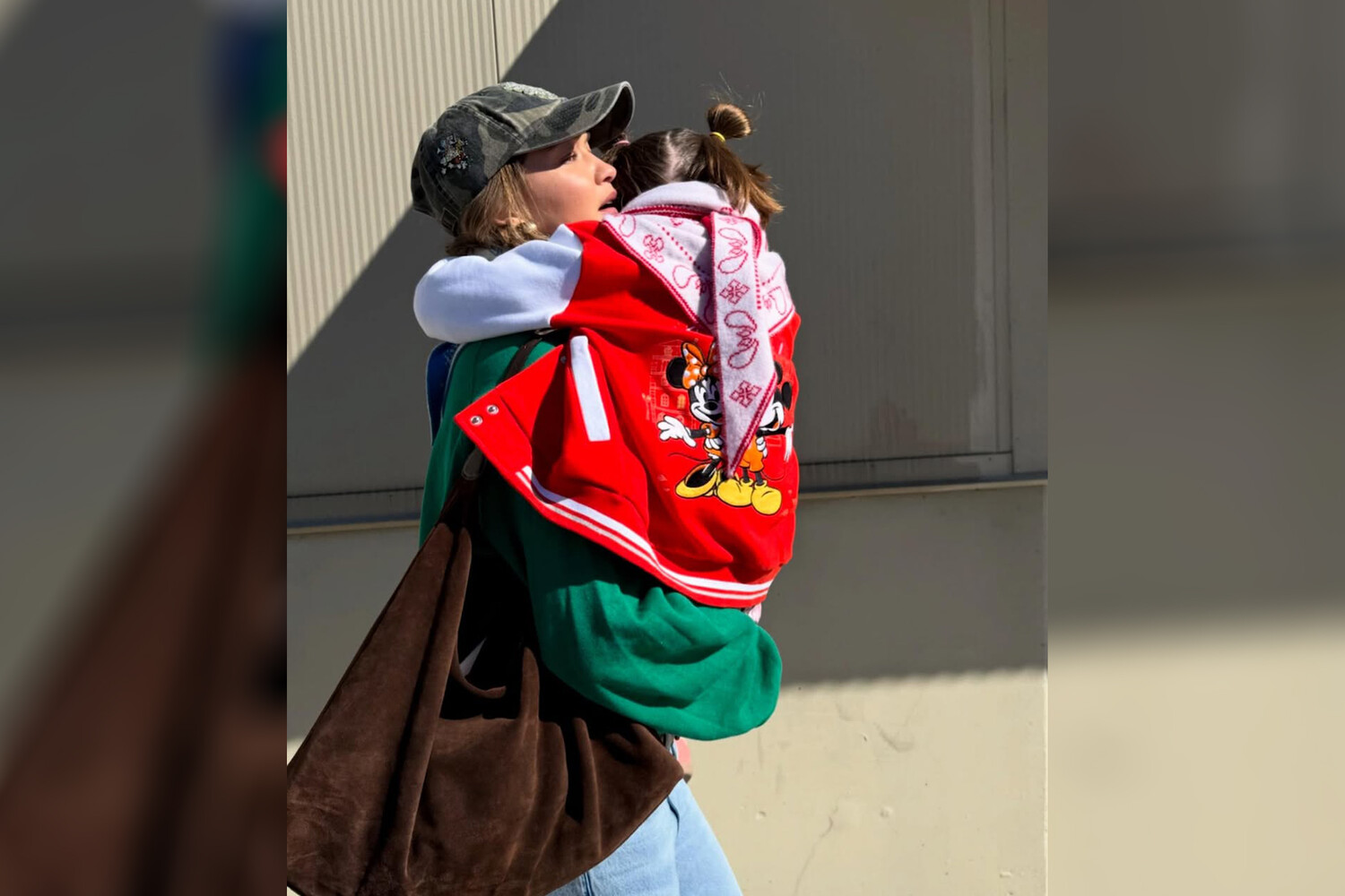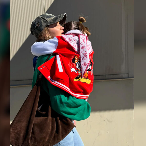 На одном из кадров Джиджи Хадид несла на руках дочь. Девочка была повернута спиной к камере. Модель вышла на публику в зеленом свитшоте, голубых джинсах и кепке в стиле милитари. Манекенщица дополнила образ коричневой сумкой на плечо. Бизнесвумен собрала волосы в косы и сделала макияж в естественном стиле. Кхай была одета в красно-белый бомбер с вышивкой и шарф.