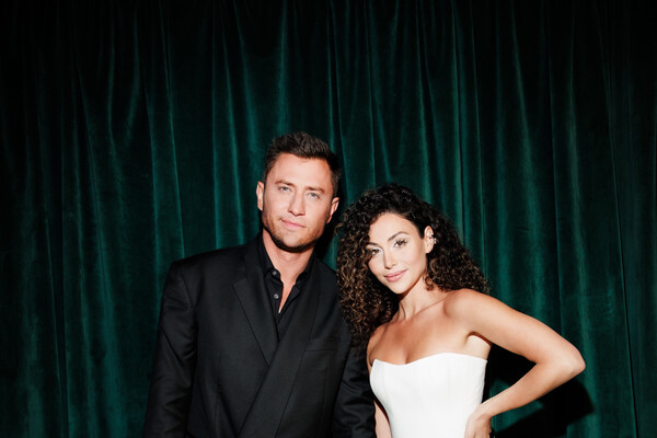 Павел Прилучный позировал в черном костюме и рубашке. Образ дополнили ботинки и сумка. Зепюр Брутян была одета в белое платье с отделкой из перьев. Пара обнималась перед камерами.
