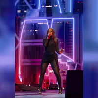 Для выхода на публику Нюша предпочла «голый» черный комбинезон и туфли на высоких каблуках и шнуровке. Певице сделали укладку с крупными локонами и вечерний макияж с угольно-черными стрелками и тенями.