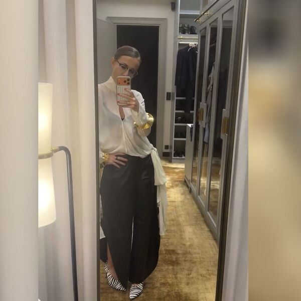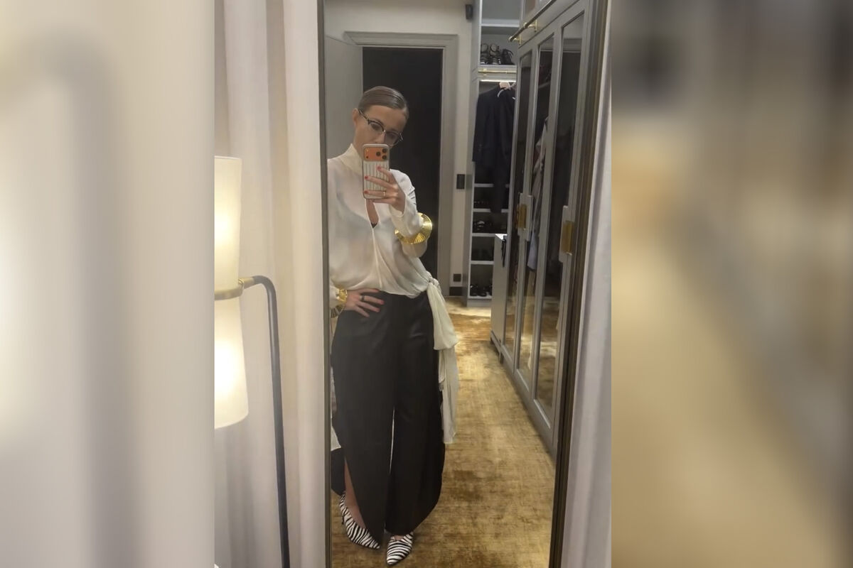 Ксения Собчак стояла перед зеркалом в белой полупрозрачной блузе, под которую надела черный бюстгальтер. Журналистка дополнила образ кожаными брюками с разрезами, туфлями на каблуках с анималистичным принтом и золотыми браслетами. Телеведущая позировала с гладким низким пучком и макияжем.