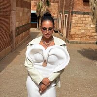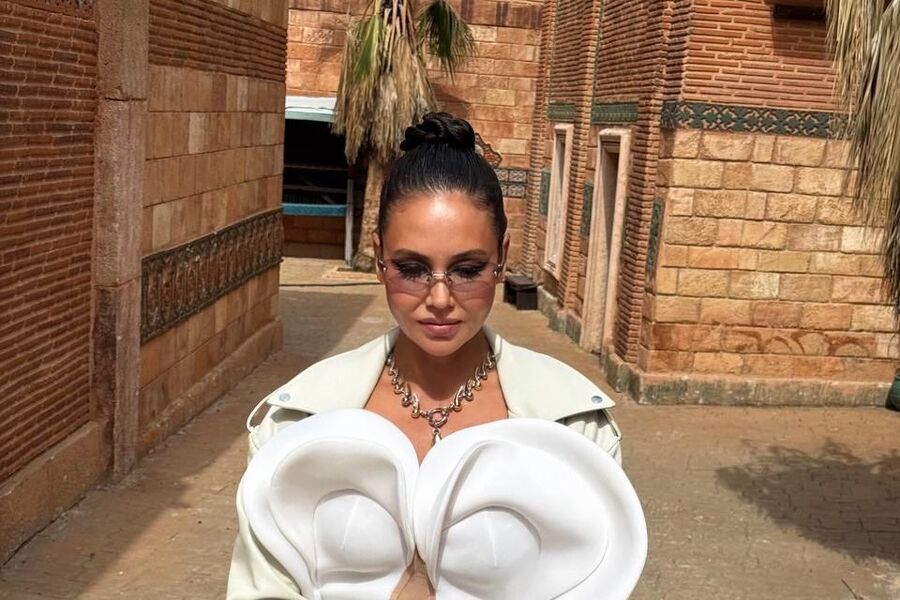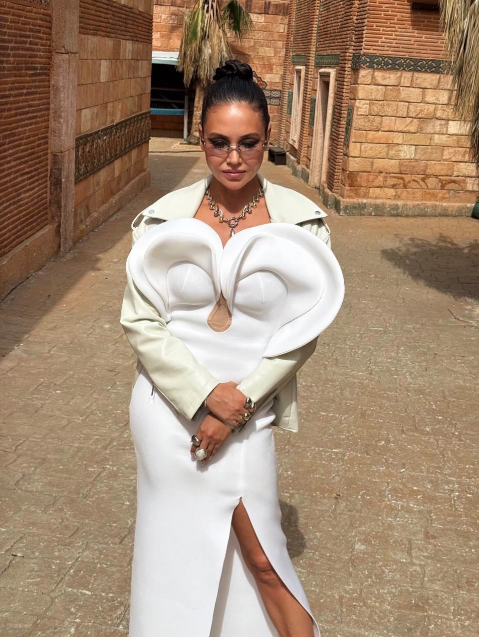 Ляйсан Утяшева позировала перед камерой в белом макси-платье с разрезом и аппликацией на лифе, которое дополнила кожаной курткой в тон. Бывшая гимнастка завершила образ очками, массивной цепью и кольцами. Знаменитости уложили волосы в высокий пучок и сделали макияж с черными стрелками. Фото были сделаны во время съемок шоу «Выжить в Стамбуле».