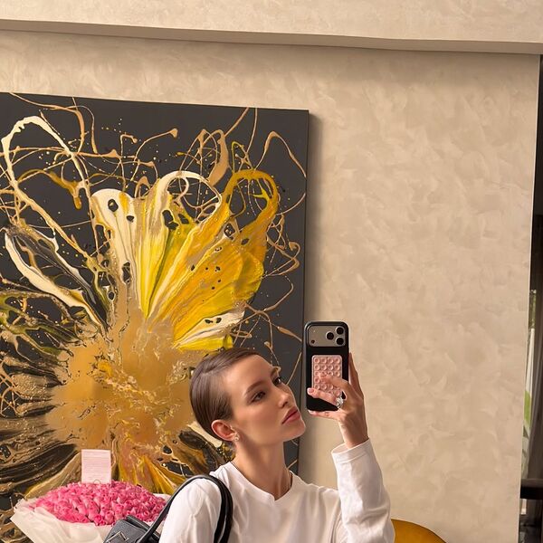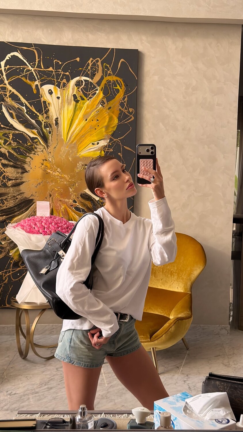 Валентина Иванова стояла перед зеркалом в белом лонгсливе, который сочетала с голубыми джинсовыми шортами. Модель дополнила образ черной кожаной сумкой Hermes, серьгами и кольцом с бриллиантом. Возлюбленная Тимати собрала волосы в гладкий пучок и сделала макияж в естественном стиле.