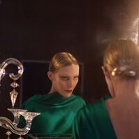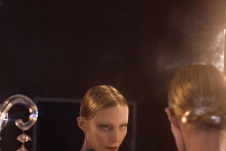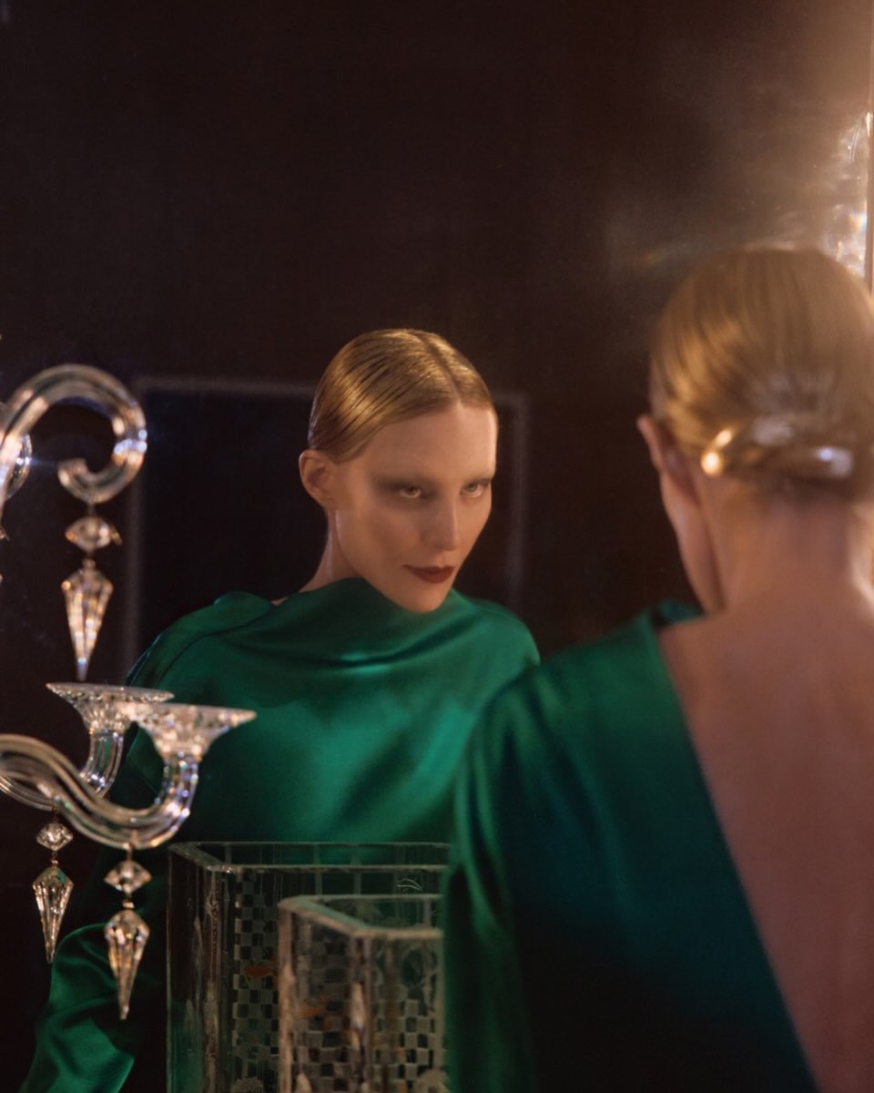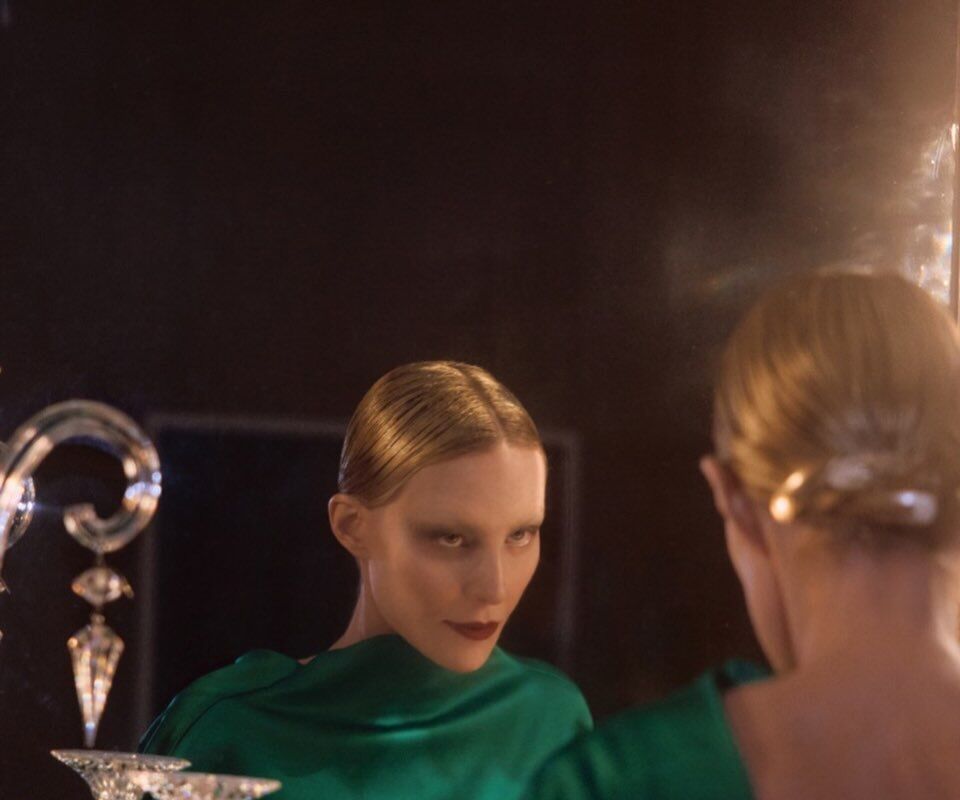 59-летняя Рената Литвинова была одета в зеленом платье с голой спиной. Волосы актрисы уложили в низкий пучок, а также сделали макияж с имитацией отсутствия бровей, красной помадой и темными тенями. Съемка прошла в винтажном интерьере.