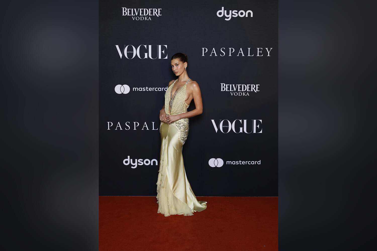 Хейли Бибер позировала в ванильном платье с глубоким декольте и голой спиной. Винтажный наряд модель предпочла из коллекции бренда Versace. Бибер также сделала аккуратный низкий пучок и вечерний макияж.