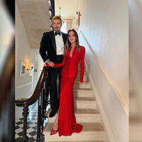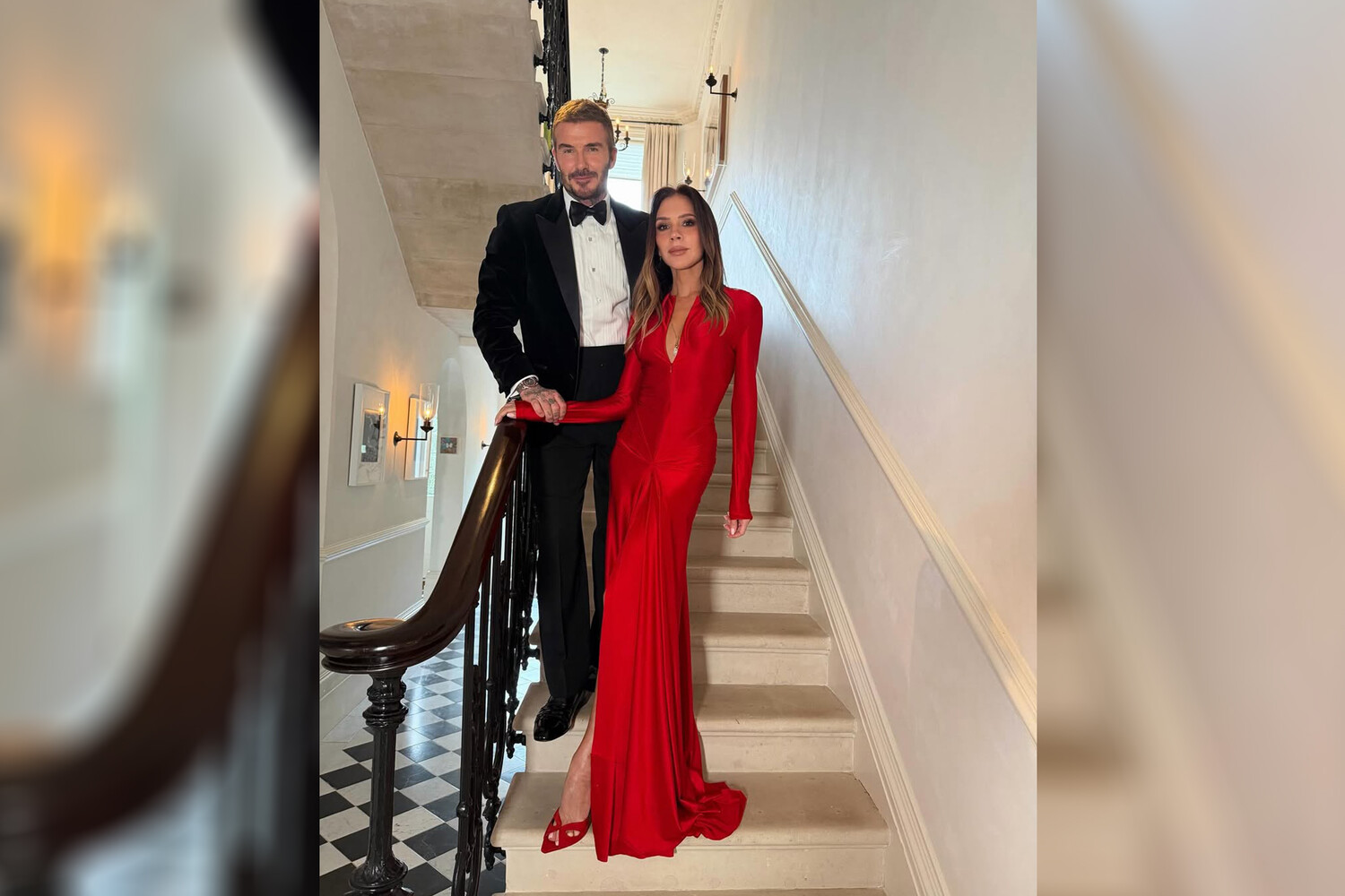51-летняя Виктория Бекхэм и Дэвид были запечатлены в доме. Дизайнер позировала в красном облегающем макси-платье с глубоким декольте и разрезом. Она также надела босоножки на каблуках в тон и золотую цепочку с кулоном. Знаменитость предстала с уложенными волосами и макияжем. Дэвид Бекхэм был одет в белую рубашку с бабочкой, черный брючный костюм и туфли.