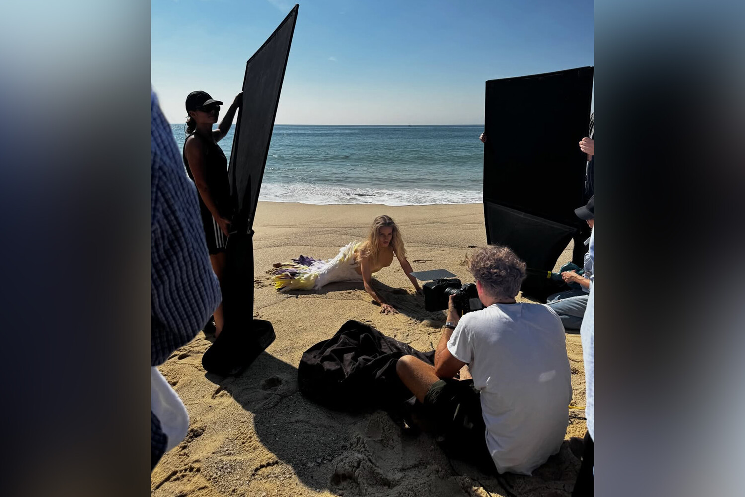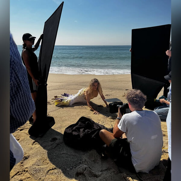 38-летняя Рози Хантингтон-Уайтли показала бекстэйдж со своей недавней фотосессии в Сиднее. На одном из фото модель предстала в облегающем платье с телесным верхом и юбкой, украшенной перьями. Манекенщица позировала перед камерой с распущенными волосами и макияжем. Знаменитость лежала на песке на фоне океана.