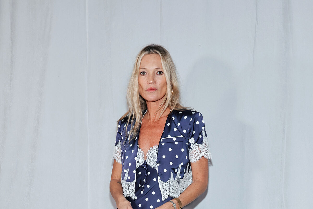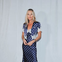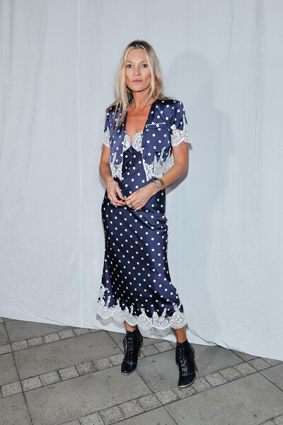 52-летняя Кейт Мосс позировала в синем платье с полька-дот и белым кружевом. Образ дополнили часы и золотой браслет, а также черные сапоги на шнуровке. Волосы ей уложили мягкими локонами и сделали легкий вечерний макияж.