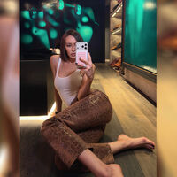 Валентина Иванова сидела перед зеркалом в белой майке, которую сочетала с коричневыми кожаными брюками со змеиным принтом. Модель также надела кольцо с массивным бриллиантом. Девушка Тимати позировала с уложенными распущенными волосами и макияжем с черными стрелками и блеском для губ. Она сидела на полу в гардеробной.