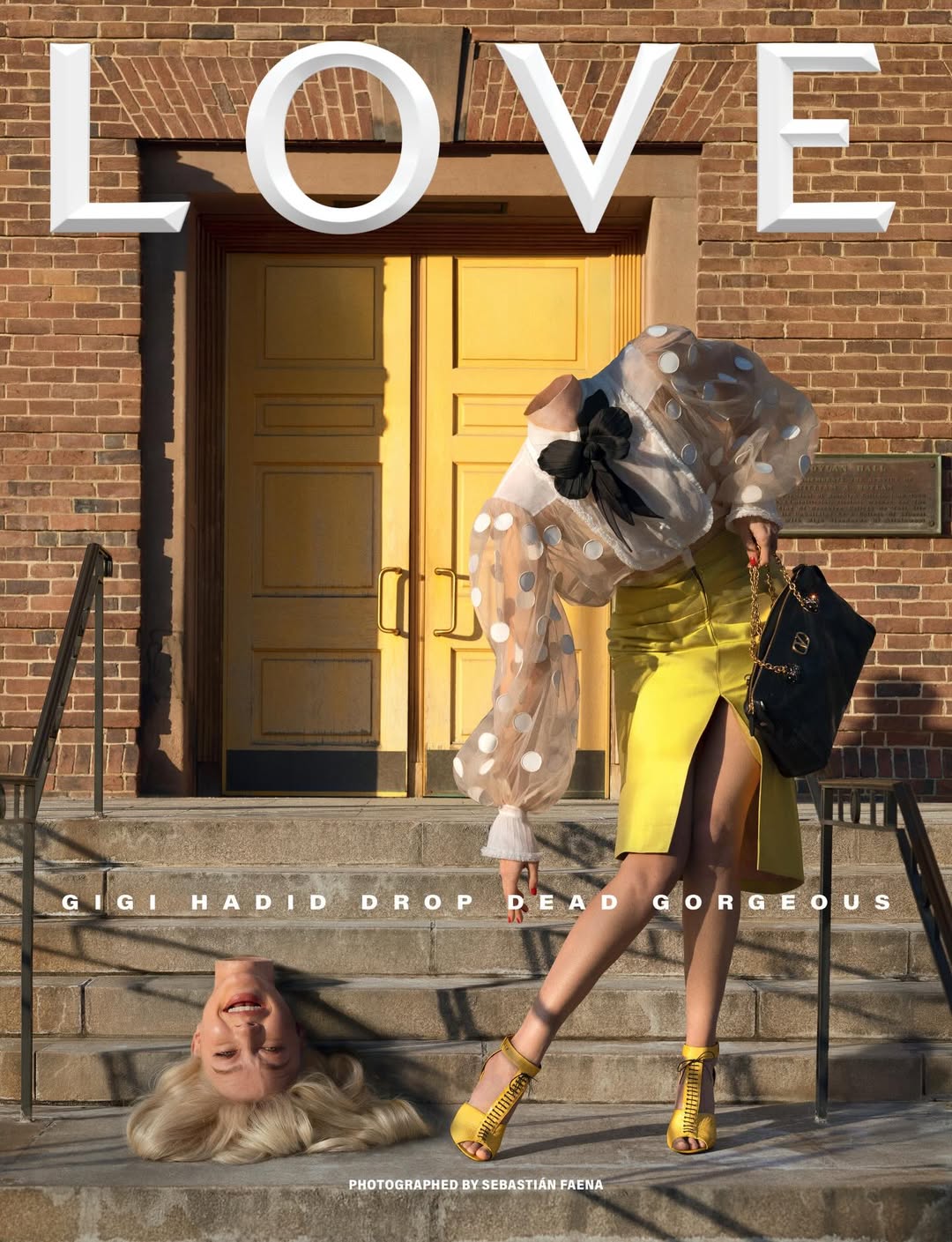 Джиджи Хадид стала героиней нового выпуска журнала Love. Супермодель была запечатлена на обложке без головы. Манекенщица позировала в белой прозрачной блузе в горошек с черным бантом, желтой юбке-карандаш с разрезом и босоножках на каблуках. В руке звезда подиумов держала черную сумку. Джиджи Хадид сделали укладку и макияж в естественных тонах. На других фото она позировала с розовыми волосами. Автором съемки выступил фотограф Себастьян Фаэна.