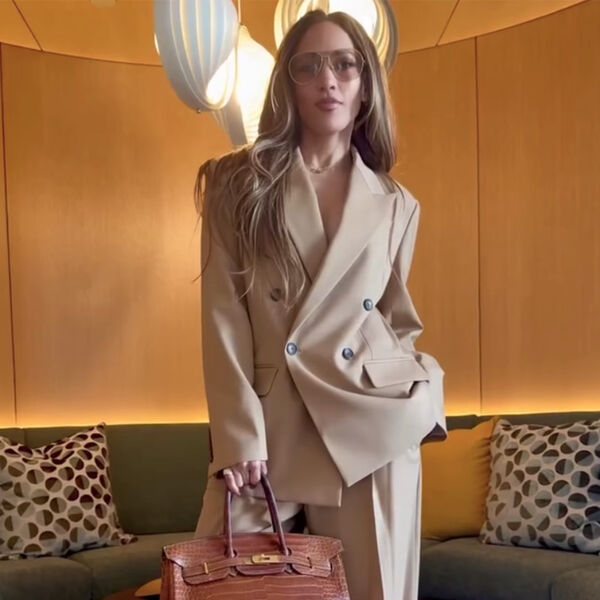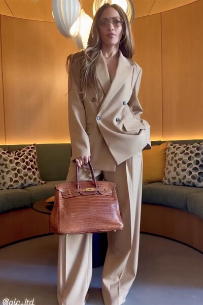 56-летняя Дженнифер Лопес предстала перед камерой в бежевом костюме, состоящем из жакета и широких брюк. Актриса добавила к комплекту туфли на каблуках, очки и коричневую сумку Hermes Birkin из крокодиловой кожи. На онлайн-платформе для продажи вещей Wararni изделие можно купить за €69.103 (6 221 930 рублей.— прим. ред.).