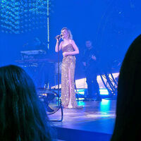 Полина Гагарина вышла на сцену в золотом платье с разрезом до бедра и глубоким декольте. Образ дополнили массивные серьги и туфли на высоких каблуках. Волосы ей уложили мягкими локонами и сделали вечерний макияж.
