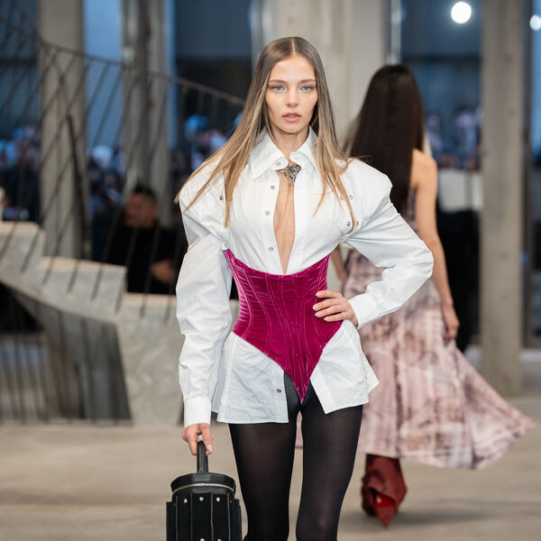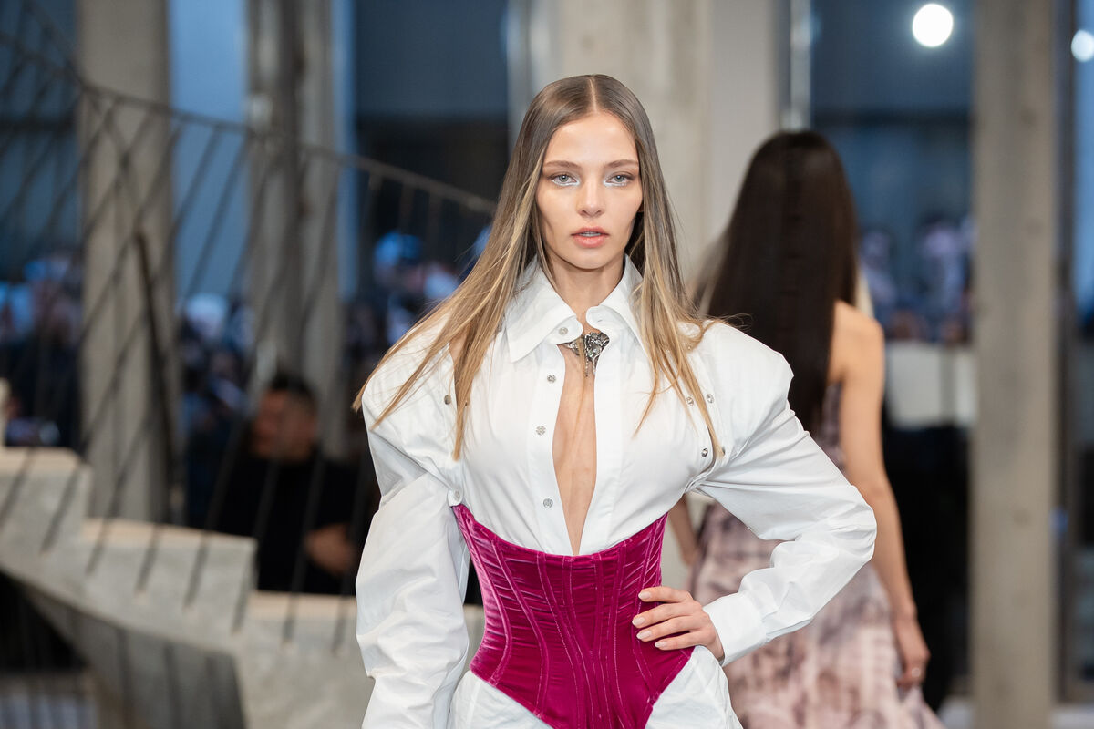 Алеся Кафельникова вышла на подиум в белой рубашке, колготках и розовом корсете. Образ дополнила черная сумка-мешок и атласные туфли с лентами. Волосы ей выпрямили и сделали вечерний макияж с серебряной подводкой.
