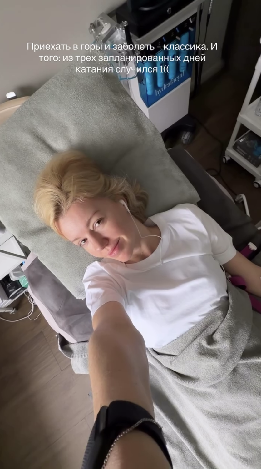 «Приехать в горы и заболеть — классика. И того: из трех запланированных дней катания случился. Хотелось бы, конечно, лежать на специальных местах для массажа в горячем бассейне, а не в кабинете врача», — написала ведущая.
