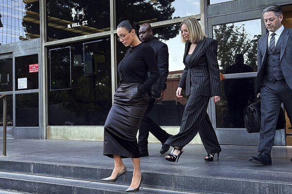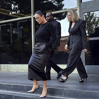 Бьянка Цензори в черной облегающей юбке из кожи и кардигане. Образ дополнили туфли-лодочки и очки. Модель дала показания по делу своего мужа Уэста о незаконном увольнении его сотрудника Тони Саксона во время реконструкции особняка в Малибу. Поклонников удивил внешний вид Цензори, поскольку она была «слишком одетая».