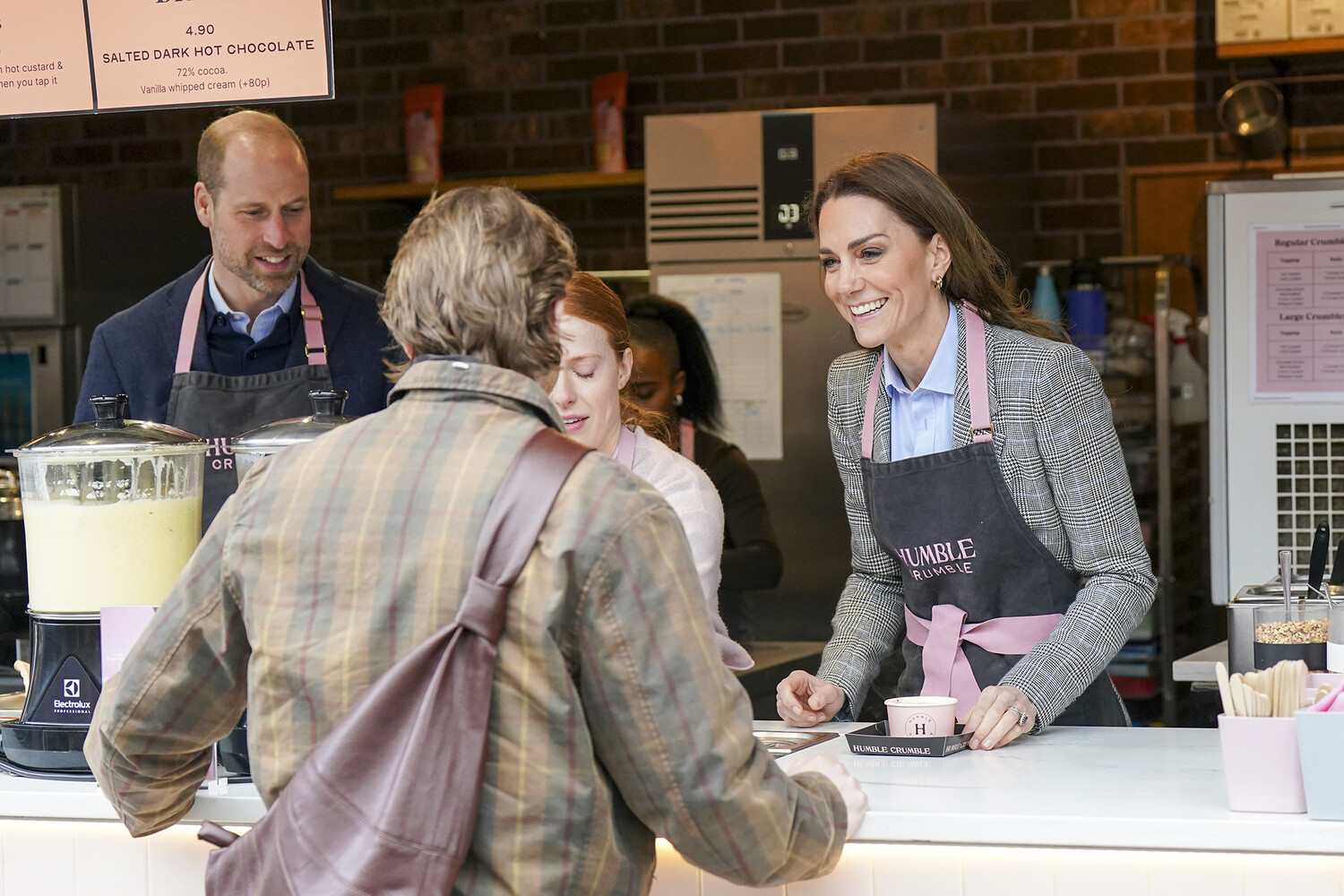 44-летняя принцесса Уэльская появилась на публике в брюках, голубой рубашке и сером жакете в клетку. Образ дополнили замшевые сапоги на каблуках. Волосы ей уложили мягкими локонами и сделали легкий макияж. Вместе с ней позировал принц Уильям в синем пиджаке, джемпере, брюках и коричневых ботинках. Пара посетила рынок в Лондоне, попробовала сыр и даже поработала в кофейне. После этого они отправились на местную пивоварню. Принцесса попробовала размешать пиво в котле и пообщались с поклонниками на улице.