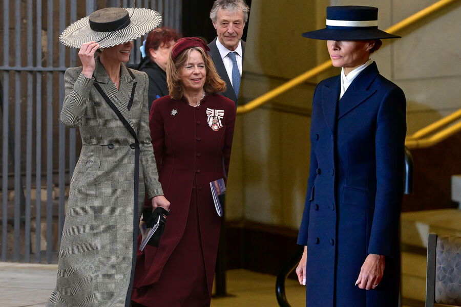 Кейт Миддлтон приняла участие в торжественной церемонии восхождения Сары Маллали на пост архиепископа Кентерберийского. Мероприятие состоялось 25 марта в графстве Кент. Принцесса Уэльская появилась на публике в образе, напоминающим наряд Мелании Трамп на инаугурации мужа в 2025 году. Жена принца Уильяма выбрала для церемонии серое клетчатое пальто Suzannah London стоимостью £2850 (около 308 тысяч рублей. — прим.ред.), широкополую шляпу Juliette Millinery за £690 (около 74 тысяч рублей. — прим.ред.) и туфли на каблуках. Она завершила сумкой Chanel и серьгами Cassandra Goad.