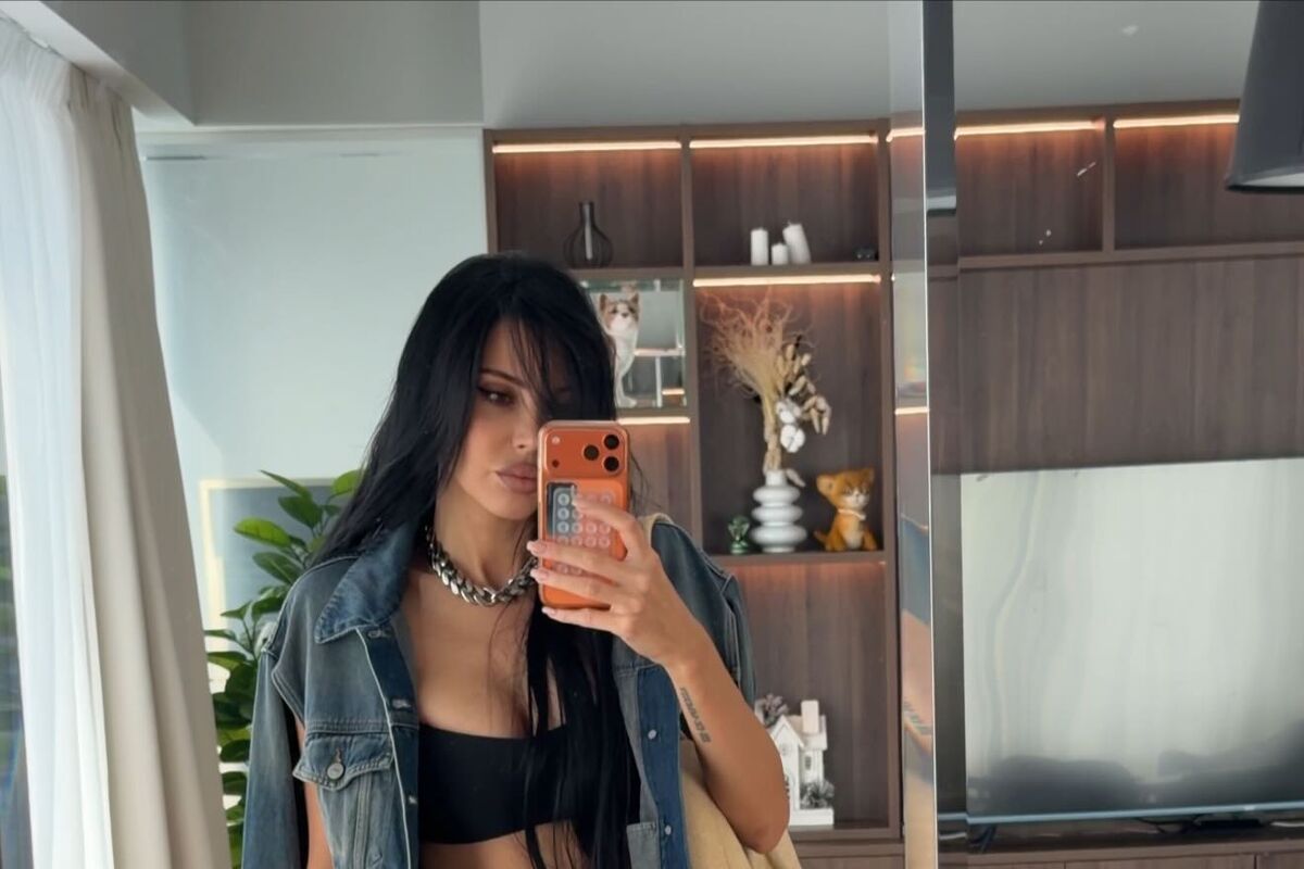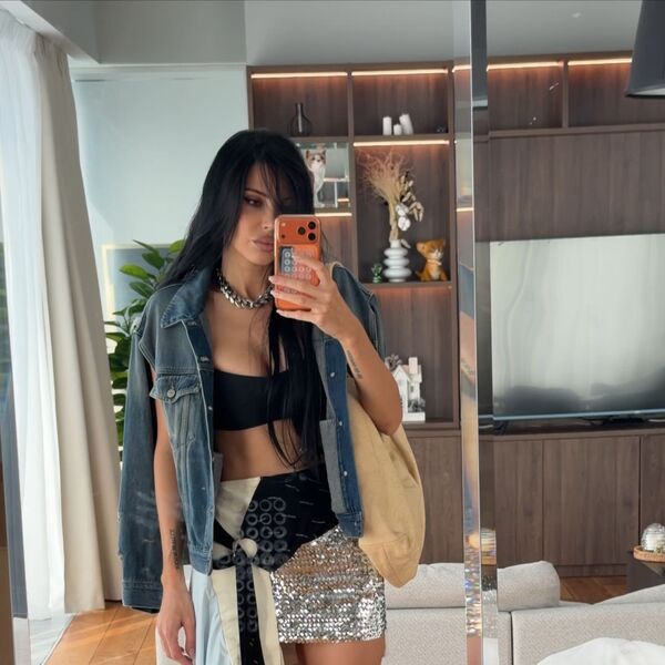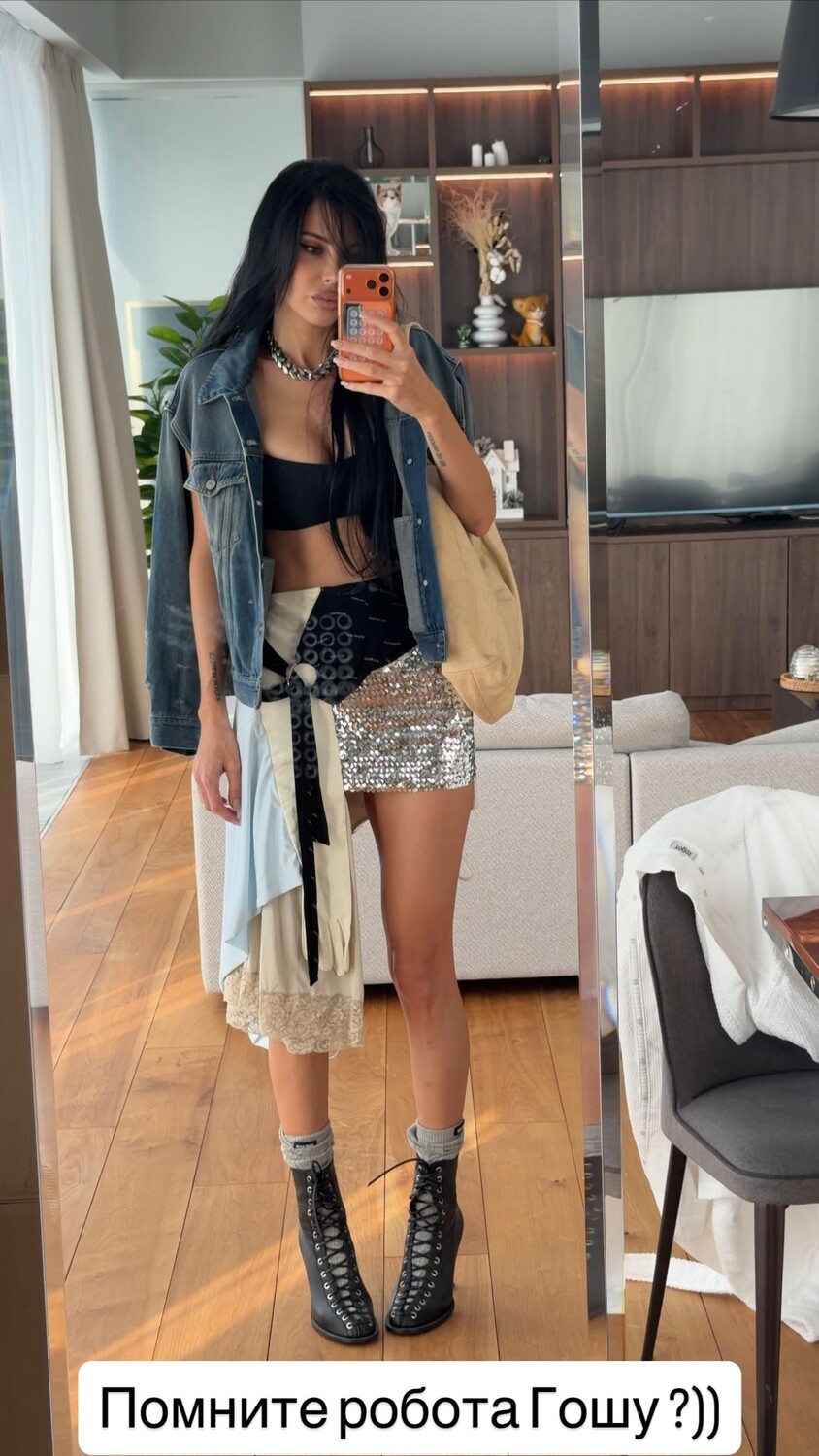 37-летняя Оксана Самойлова стояла перед зеркалом в черном бюстгальтере, который сочетала с джинсовой курткой, блестящей серебристой мини-юбкой и кожаными ботильонами на каблуках. Модель добавила к образу массивную цепь, шопер и серые носки. Блогерша позировала с распущенными волосами и макияжем с черными стрелками и темно-розовой помадой.