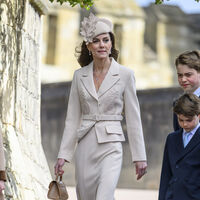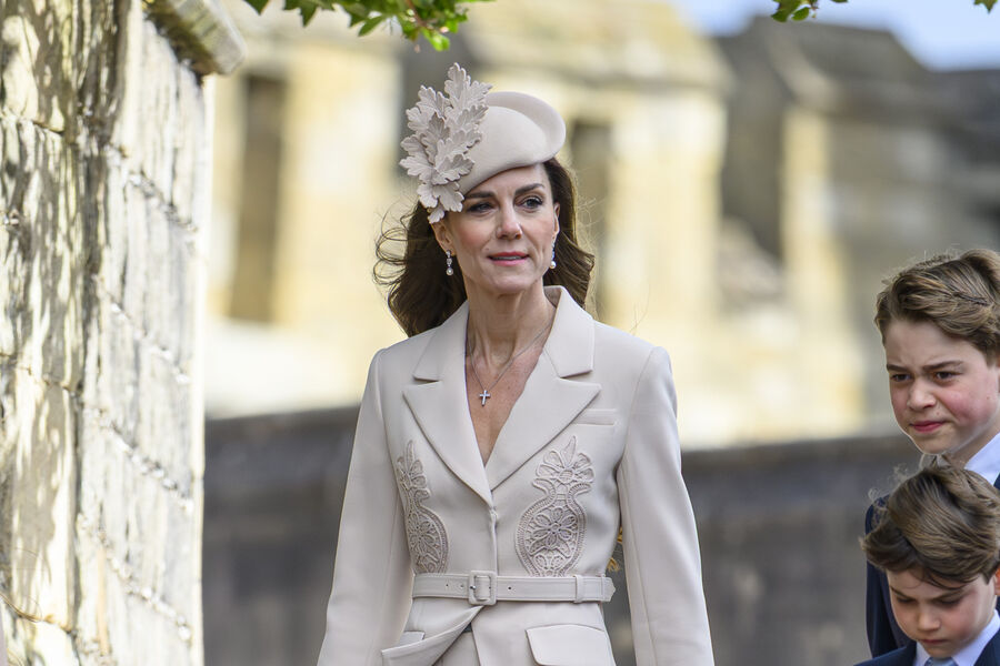 Кейт Миддлтон с принцем Уильямом и детьми были запечатлены, когда направлялись в часовню Святого Георгия. Принцесса Уэльская выбрала для мероприятия в бежевом жакете, платье-миди в тон, шляпе и коричневых туфлях на каблуках. Жена принца Уильяма также надела цепочку с крестом и серьги с жемчугом. Кейт Миддлтон вышла на публику с распущенными волосами и макияжем в естественном стиле.
